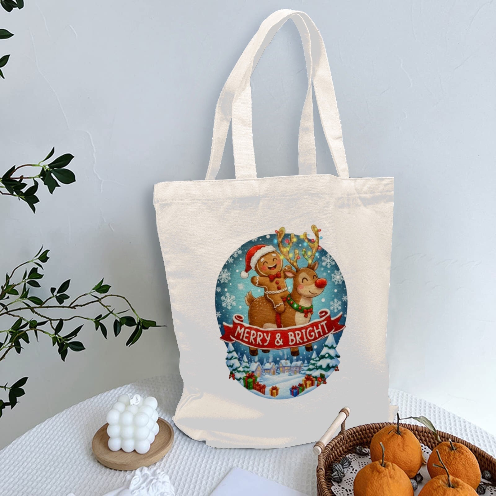 Transform your holiday season with our enchanting Merry & Bright Christmas Tote Bag! This delightful canvas bag features an adorable festive design with a cheerful gingerbread man riding a sweet reindeer, surrounded by snowflakes and holiday magic.