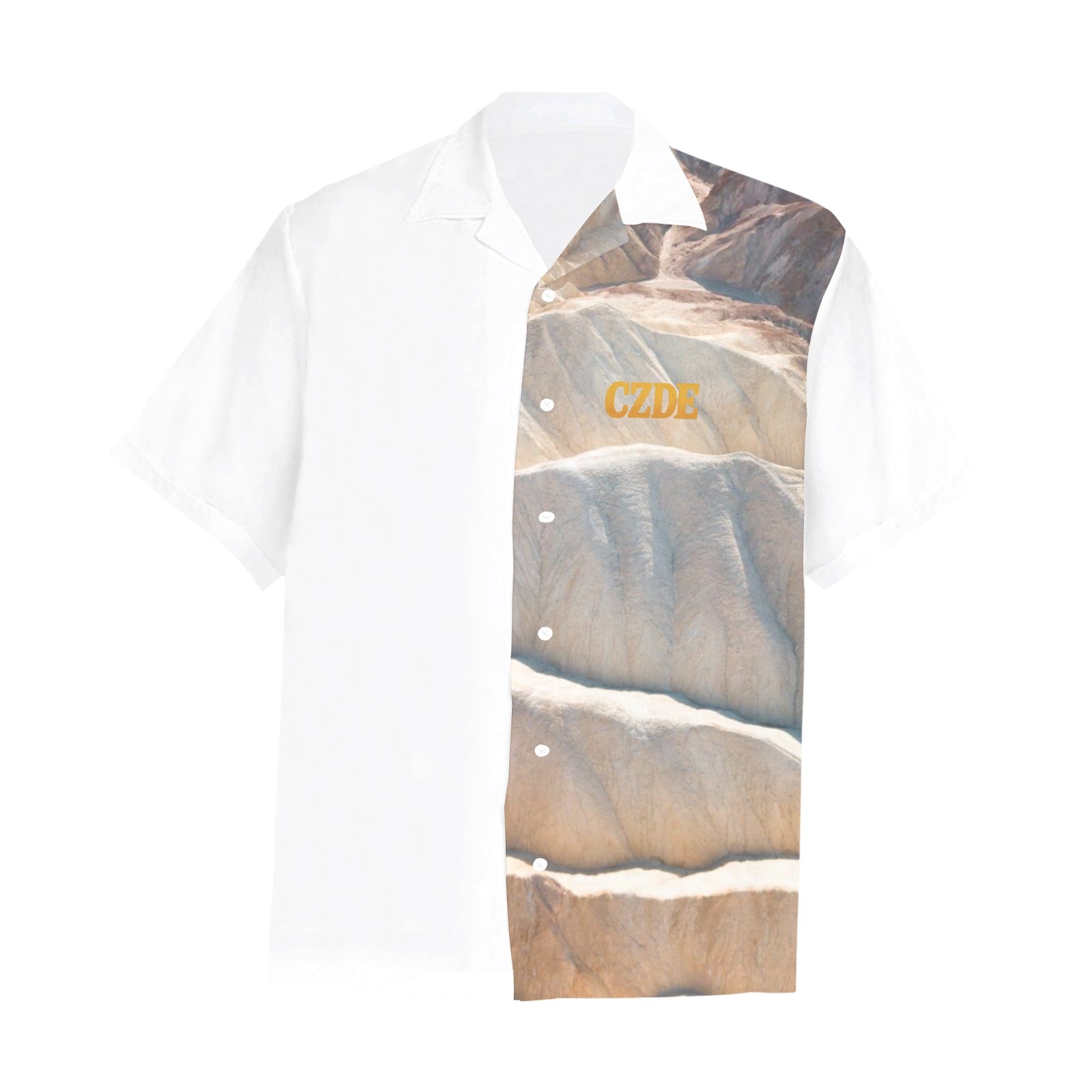 Stand out this summer with the bold and artistic CZDE Desert Print Shirt. Featuring a unique split design – crisp white on one side and a desert landscape on the other – this short sleeve button-up shirt brings minimalism and creativity together in one iconic piece.
