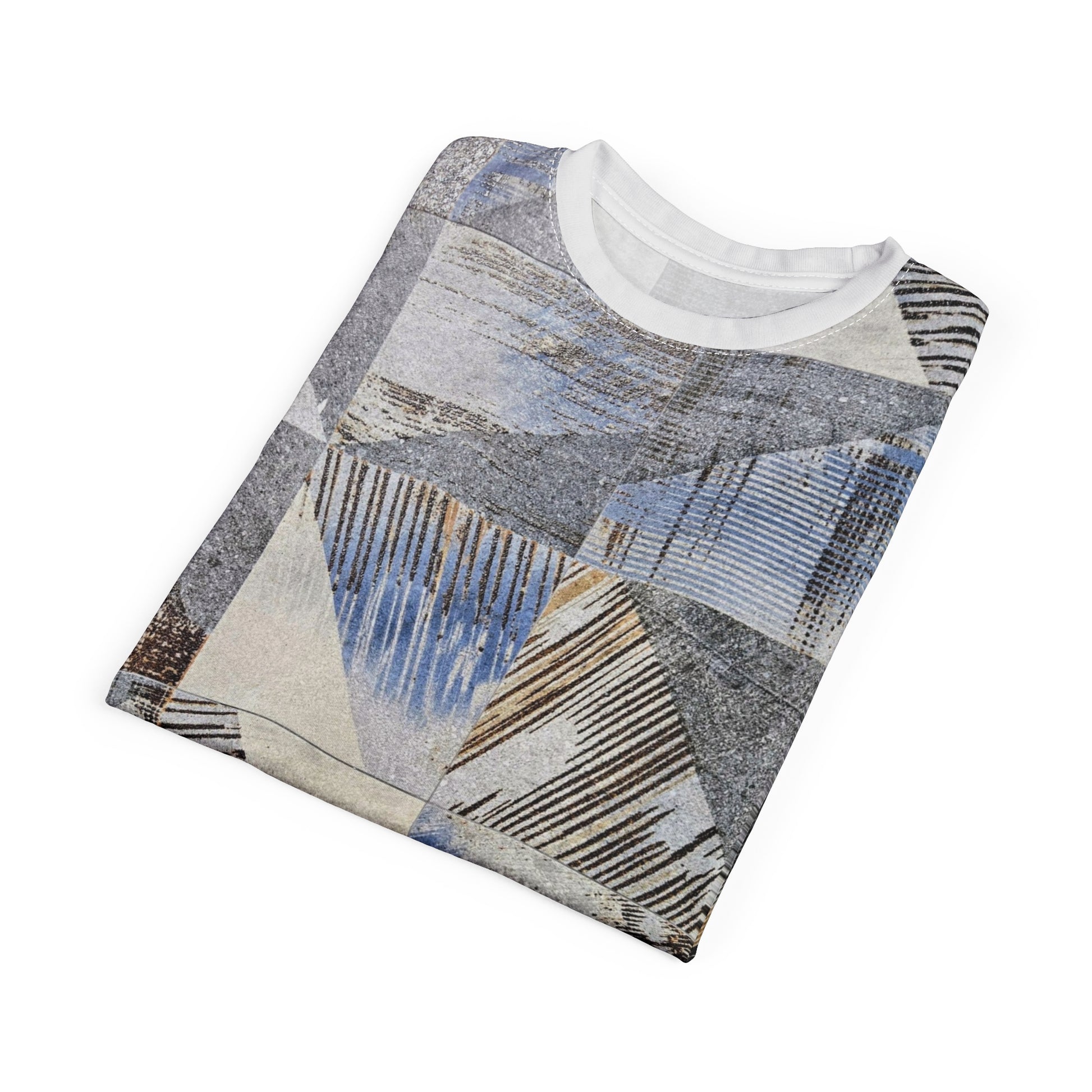 Embrace the festive spirit with this stunning Christmas Patchwork Art Tee that combines contemporary streetwear with holiday charm. This unique unisex design features an artistic blend of textured patches in blues, grays, and earth tones with bold graphic accents.
