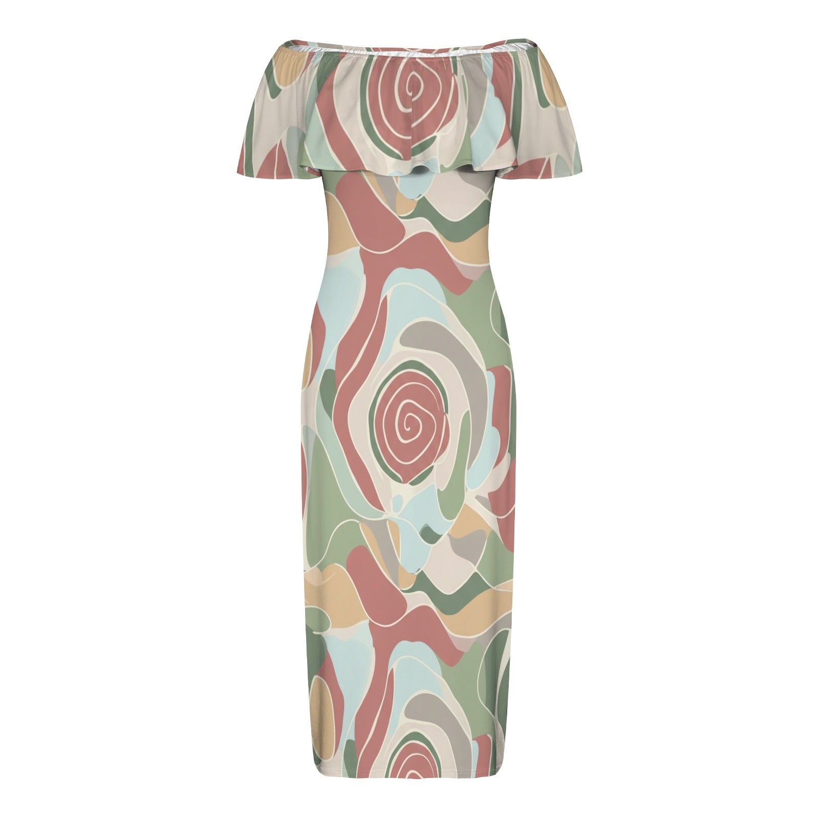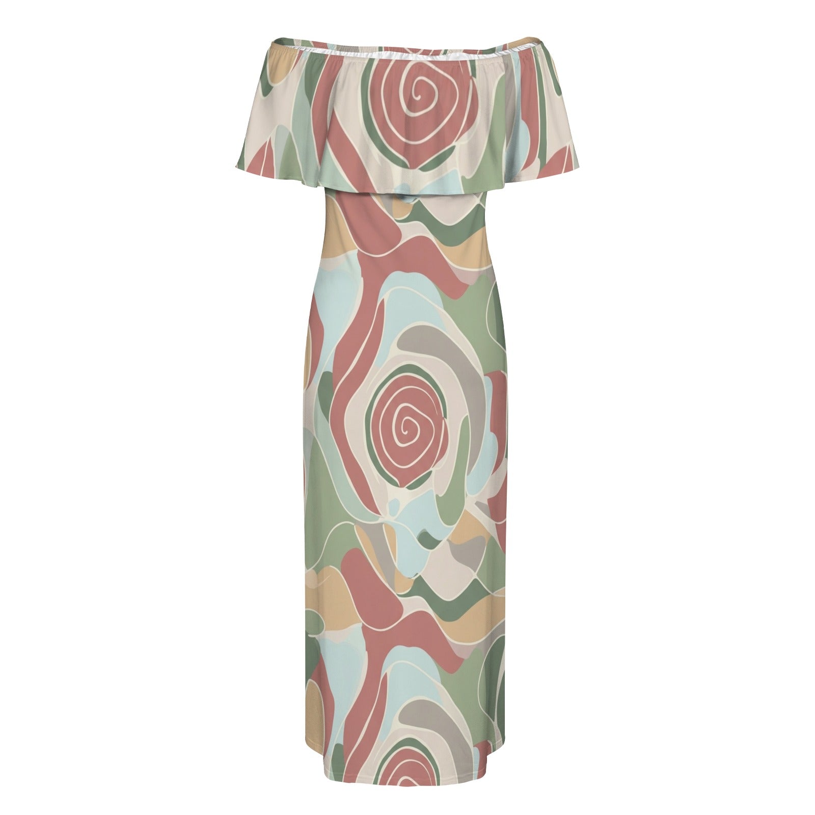Elegant off-shoulder maxi dress with a unique abstract swirl print in soft pastel tones. Lightweight fabric offers comfort and style for casual outings, vacations, or summer event